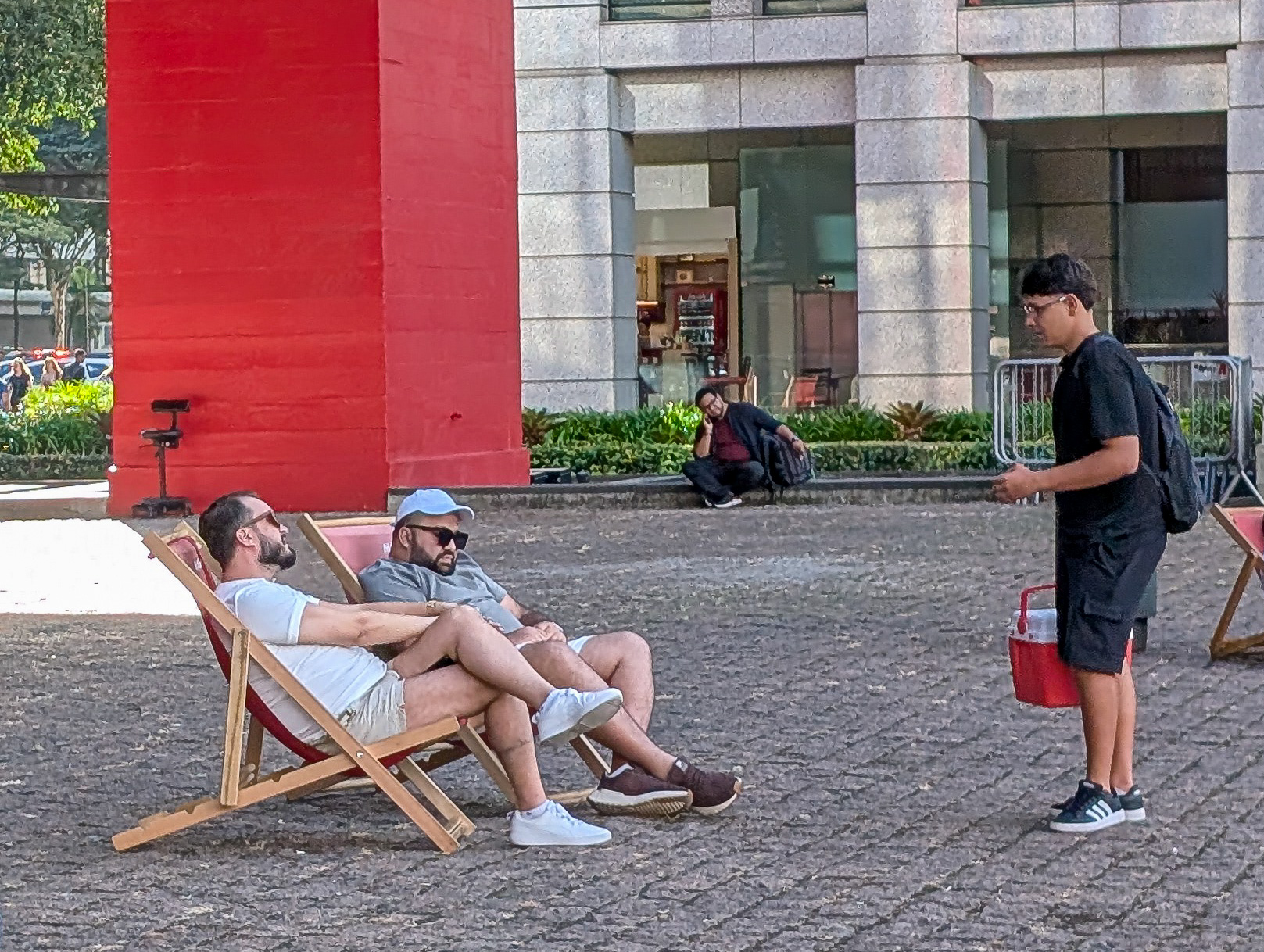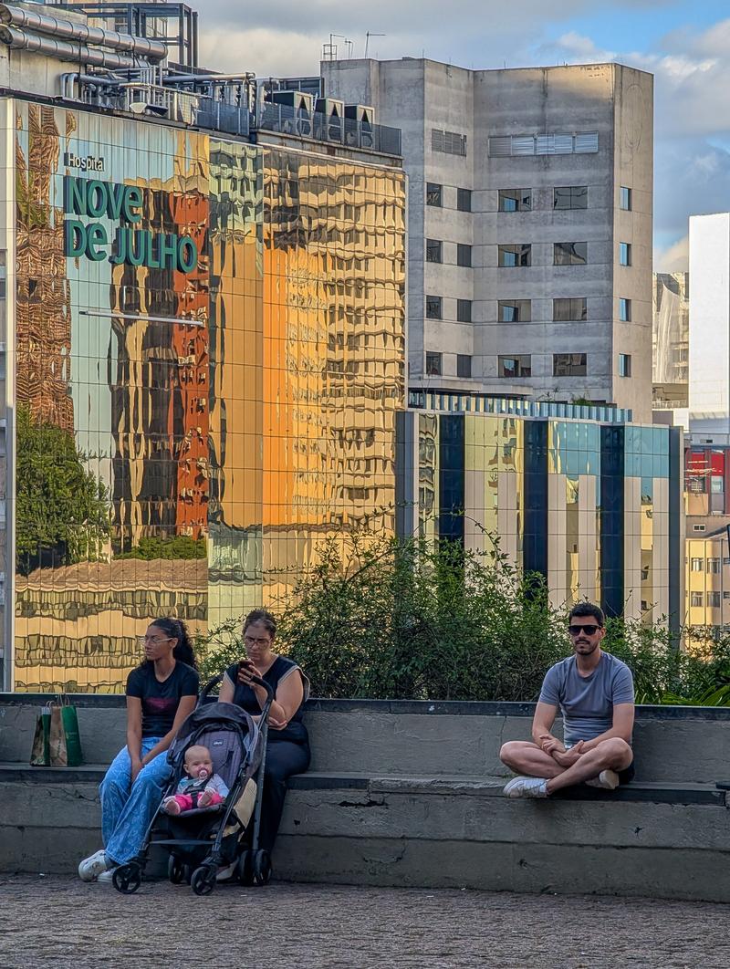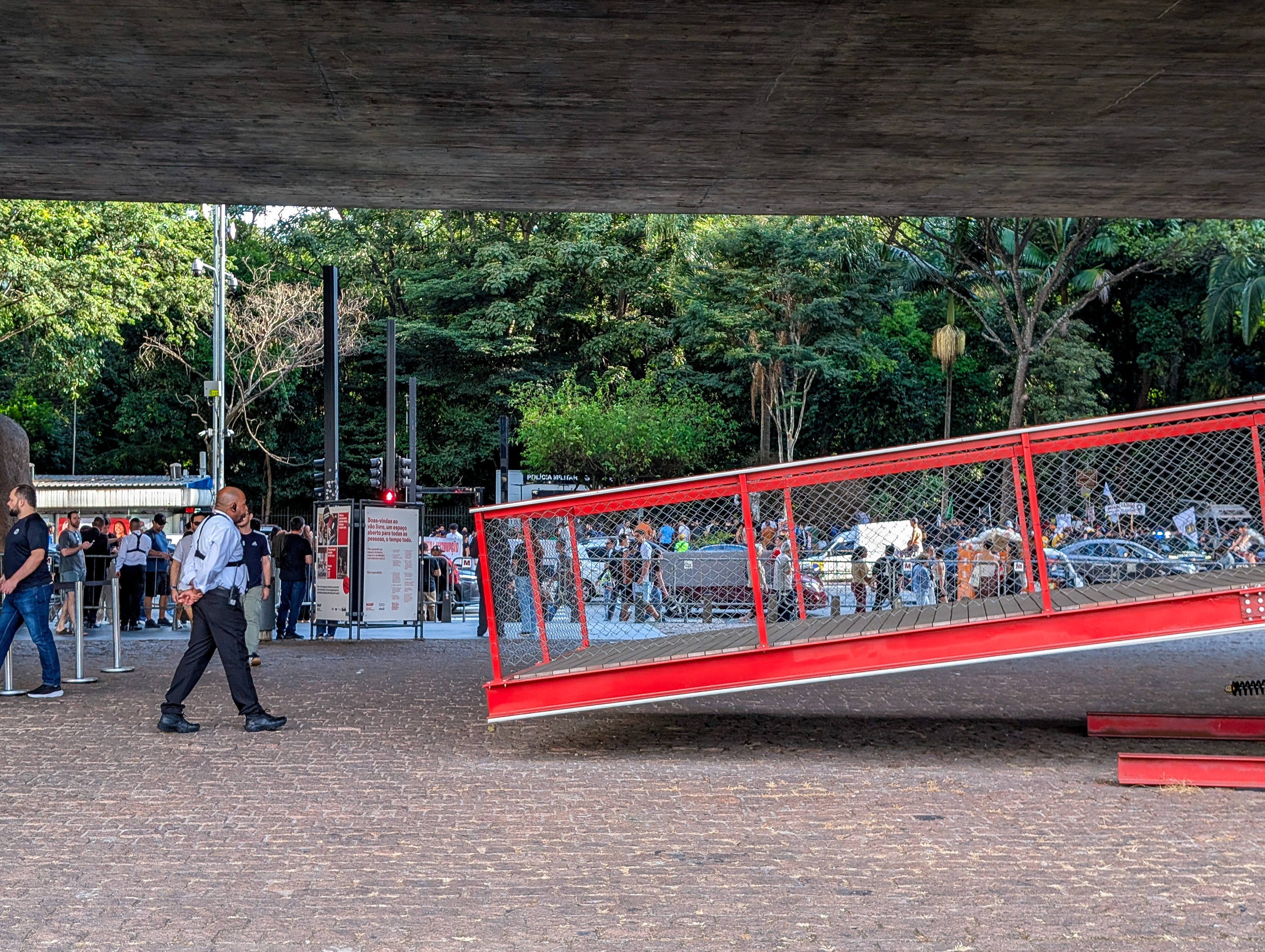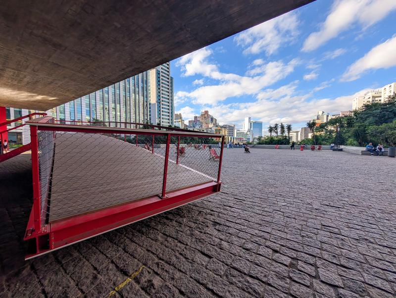MASP consists of two separate buildings. This plaza lies underneath the smaller one and has everything you could want in a public space: beautiful architecture; a view over a hill towards the massive concrete jungle of São Paulo; lounge chairs; a strolling security guard; and of course, an inaccesible red ramp that leads to nowhere.